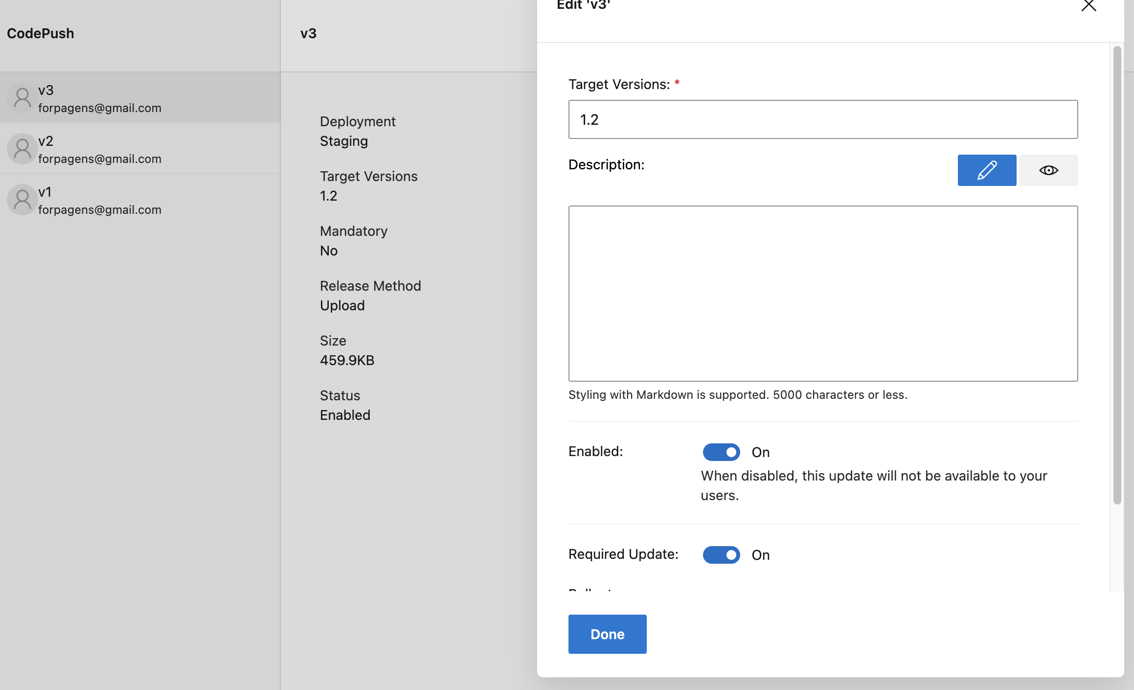 우측 상단 랜치 아이콘을 선택하여 promote 시 설정을 수정할 수 있습니다. 해당 release로 모두 강제 업데이트 시키고 싶다면 Required Update를 활성화 시켜주세요.