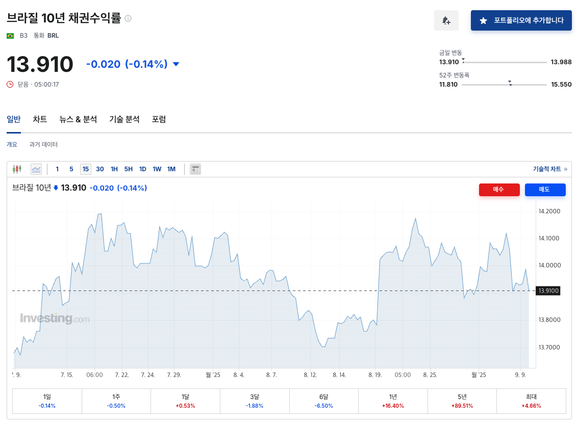 브라질 국채는 이자가 미쳤습니다. 지금 글을 쓰는 시기에도 13%입니다. 말도 안되는 이자율입니다. 우리나라 기준 금리가 2.5%라는 것을 감안했을 때, 정말 미친 이자율입니다.