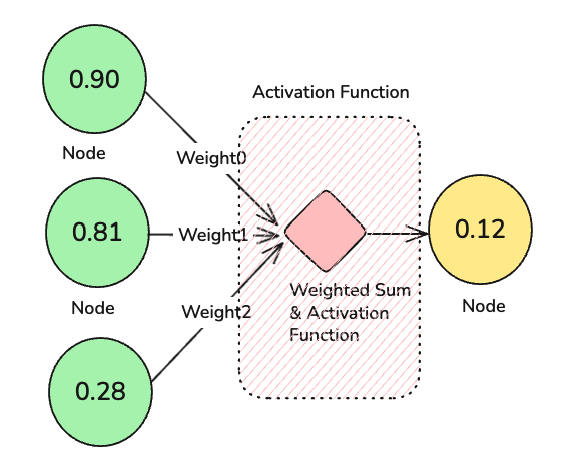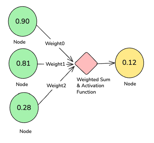 다른 노드로부터 입력 신호 (0.90, 0.81, 0.28) 을 받아 어떠한 계산을 통해 출력한 값 0.12을 가지는 노드가 있다고 가정합시다. 이 연결 집합이 뉴런 (Neuron)입니다.