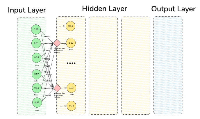 위 도식에서 Weight0, Weight1 .. 으로 출력 값을 계산할 때 사용하는 값입니다. 학습을 하는 동안 가중치는 계속 바뀝니다.