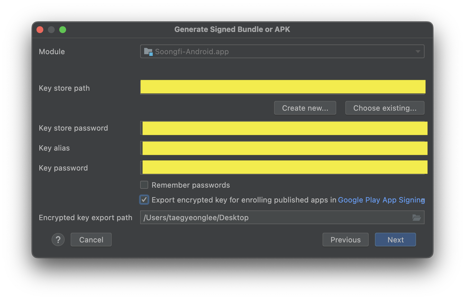 업로드 키가 존재하는 경우 서명 키 비밀번호와 alias를 입력해주시고 서명키가 없는 경우 Create New.. 를 선택하여 서명 키를 생성합니다. 기타 기본 설정을 확인한 후에 다음 단계로 진행합니다.
