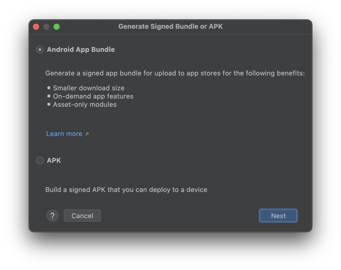 새로운 번들에 서명을 해야 합니다. Build -> Generate Singed Bundle / APK 를 선택합니다. 기본 설정(Android App Bundle)을 선택 후 다음 단계를 진행해 주세요.